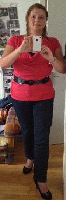 Vandaag was het al een stuk frisser dan aan het begin van de week, dus ik ben begonnen met een lange, donkere spijkerbroek. Daarbij droeg ik een ‘zalmroze?’ shirt met zwarte elastiekriem. Om het af te maken droeg ik mijn hoge zwarte pumps met gesp voorop.
