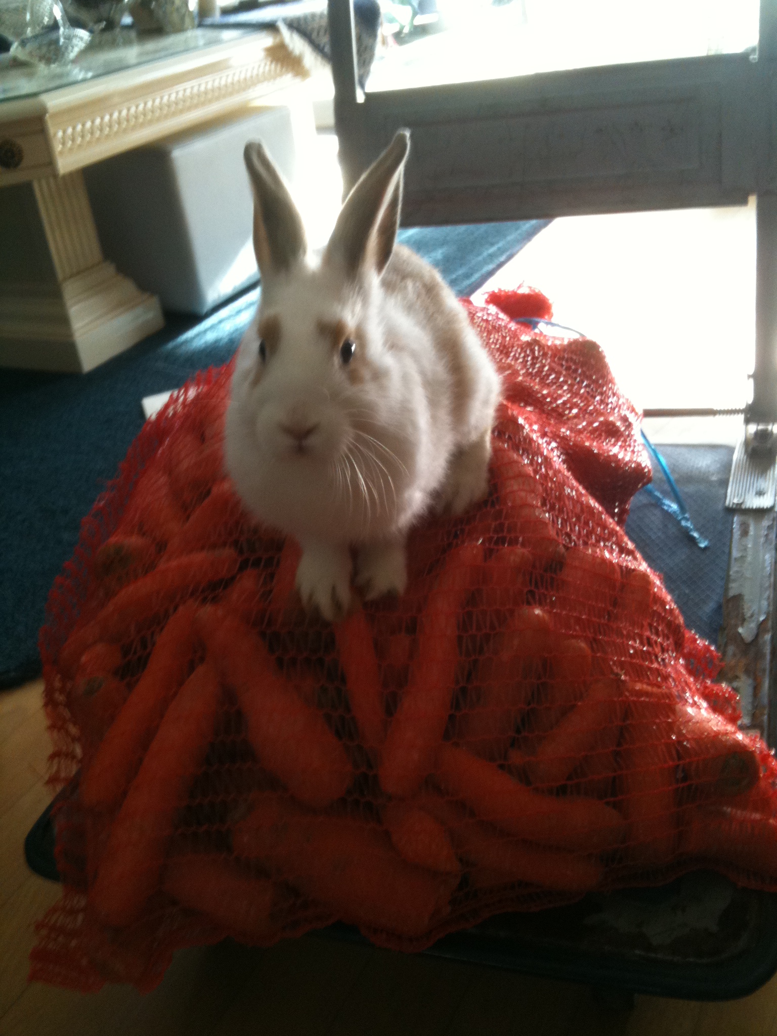Ik ben dan wel wat kleiner dan de andere konijntjes hier, maar denk maar niet dat ik te weinig eet hoor. Ik eet voor tien. Die zak wortelen waar ik bovenop zit? Die kan ik in een dag helemaal alleen opeten, dat weet ik zeker. Helaas moest ik hem wel delen met de rest.