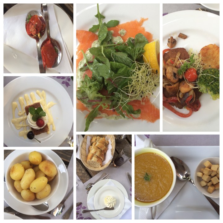 Verse groenten, aardappelen en vlees, bijna iedere dag. Standaard maar wel lekker. Zaterdagavond gingen we heerlijk uit eten, we kregen van tevoren een amuse en stokbrood met kruidenboter. De maaltijd bestond voor mij uit een kerriesoepje vooraf, vervolgens een salade van gerookte zalm, sla en rucola, een luxe schnitzel met champignons, paprika en ui, broccoli en kool, krieltjes en rostirondjes en na afloop een huisgemaakte tiramisu.