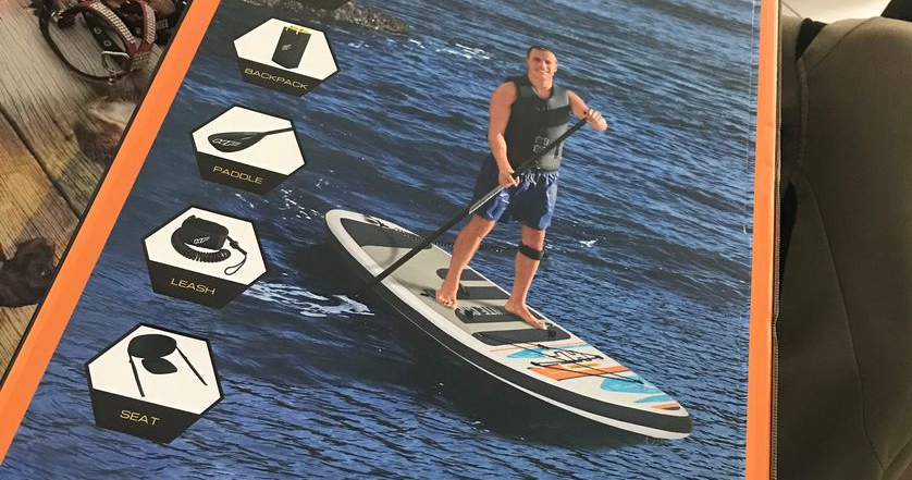 Net voor het weekend werd hij bezorgd, en ik heb hem natuurlijk meteen uitgepakt. Er zit ook een kajakzitje bij, zodat ik hem zowel zittend als staand kan gebruiken.