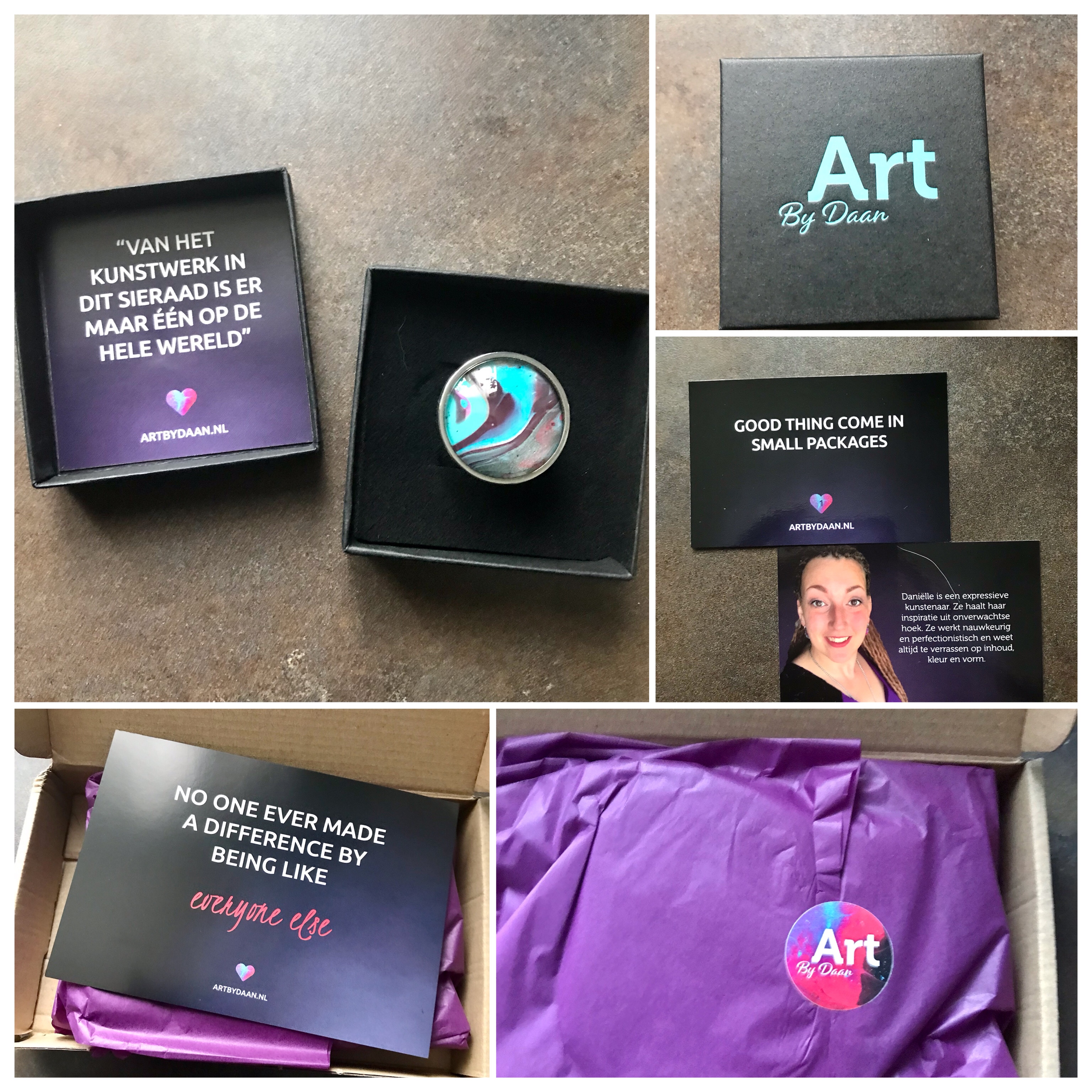 Voor mij maakte Daniëlle deze mooie, opvallende ring. Er wordt duidelijk zorg en aandacht besteed aan iedere bestelling, de ring werd mooi verpakt in een brievenbusdoosje bezorgd. Bij het uitpakken vond ik een keurig sieradendoosje, met daarin mijn ring. In het echt is hij nog mooier dan op de foto.