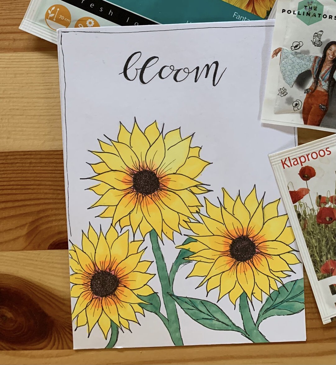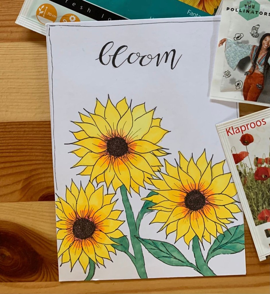 Tot slot maakte ik voor een swap deze kaart met zonnebloemen. Hij is gemaakt met fineliners en alcoholmarkers.