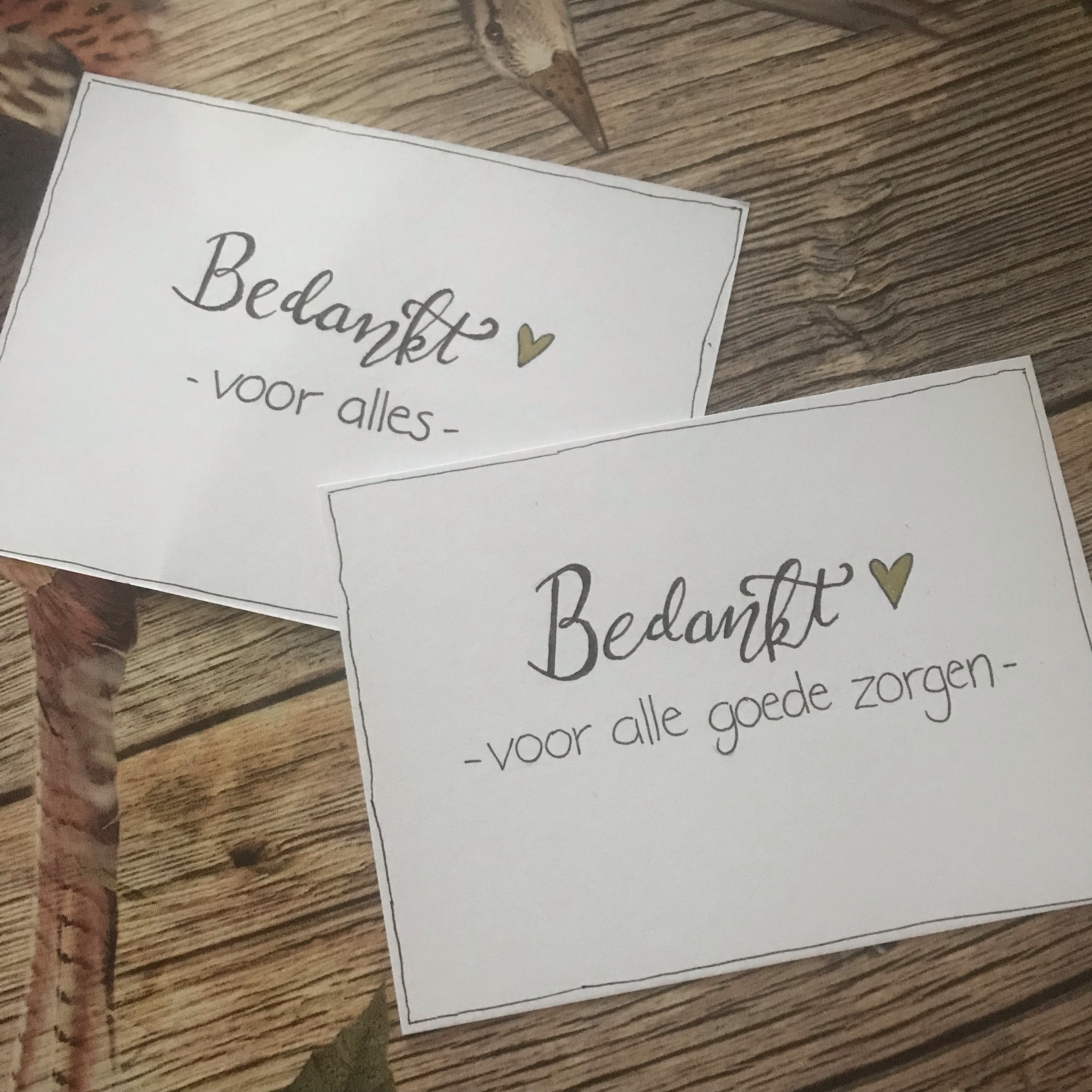 Kaartjes die je eigenlijk nooit wil maken… één voor de uitvaartondernemer en één voor de zorg. Gemaakt met fineliners en een goudpen.