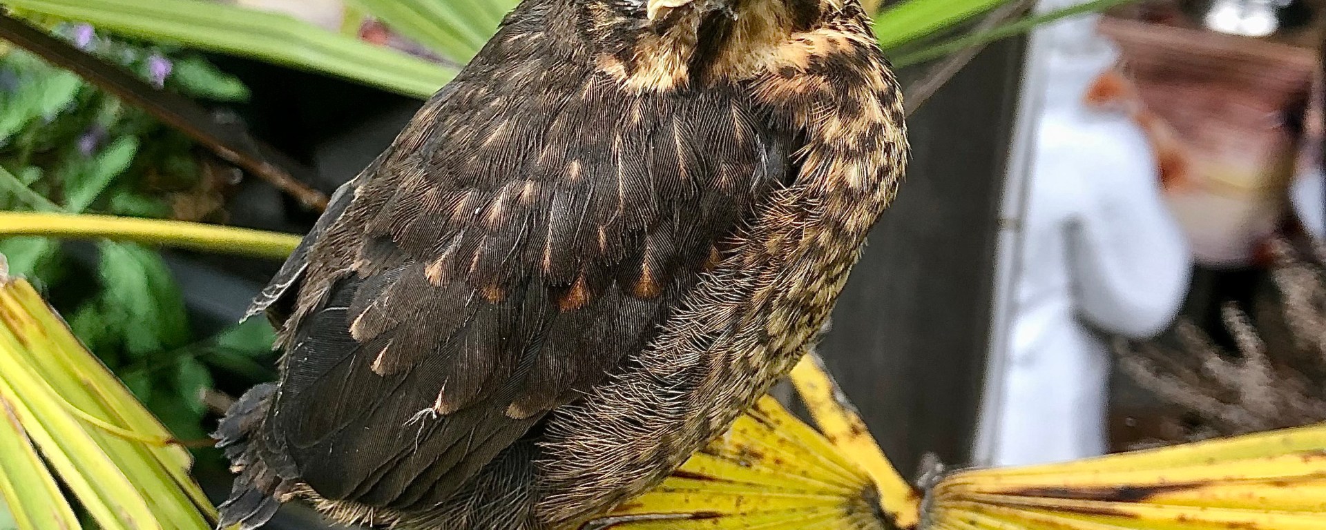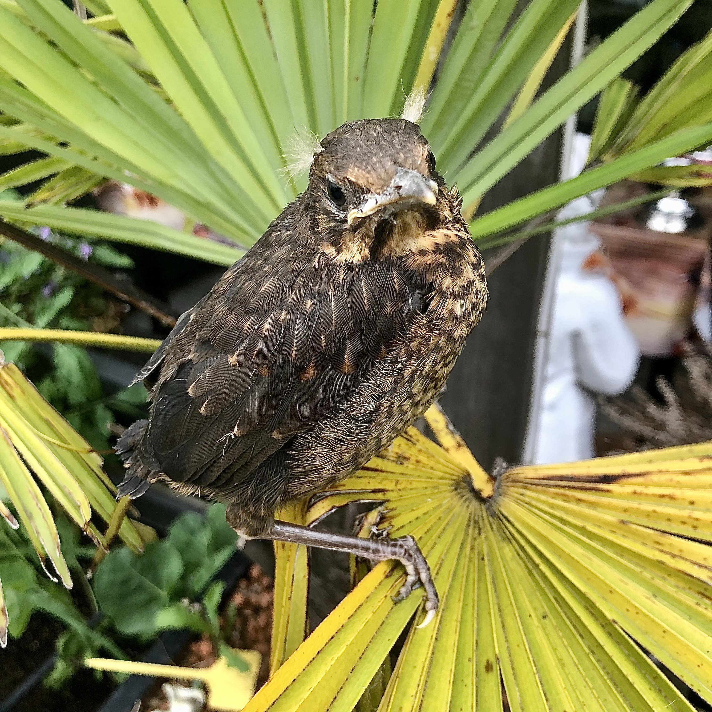 En dit is het laatste wat ik er een dag na de eerste vlucht nog van zag. Het nest was verlaten, ik kon de vogeltjes nog wel horen maar de meeste waren niet meer te zien, waarschijnlijk zaten ze in de bomen bij onze achterburen. Maar eentje was in ons eigen palmboompje geland, en hij liet me zowaar heel dichtbij komen en ging er even mooi voor zitten.