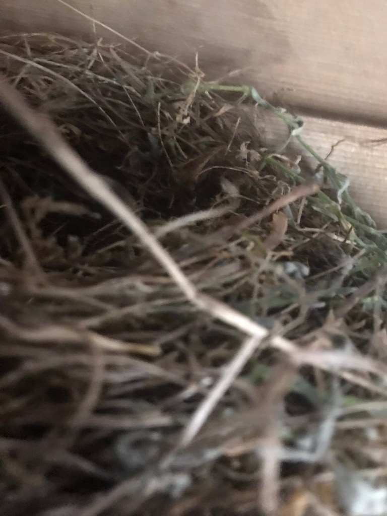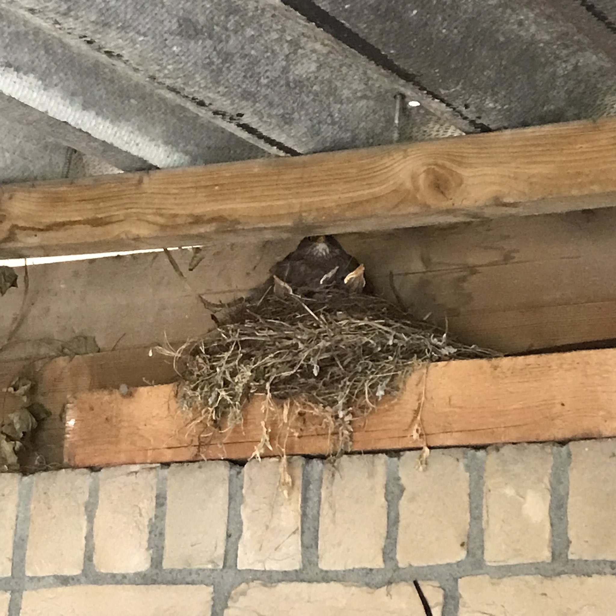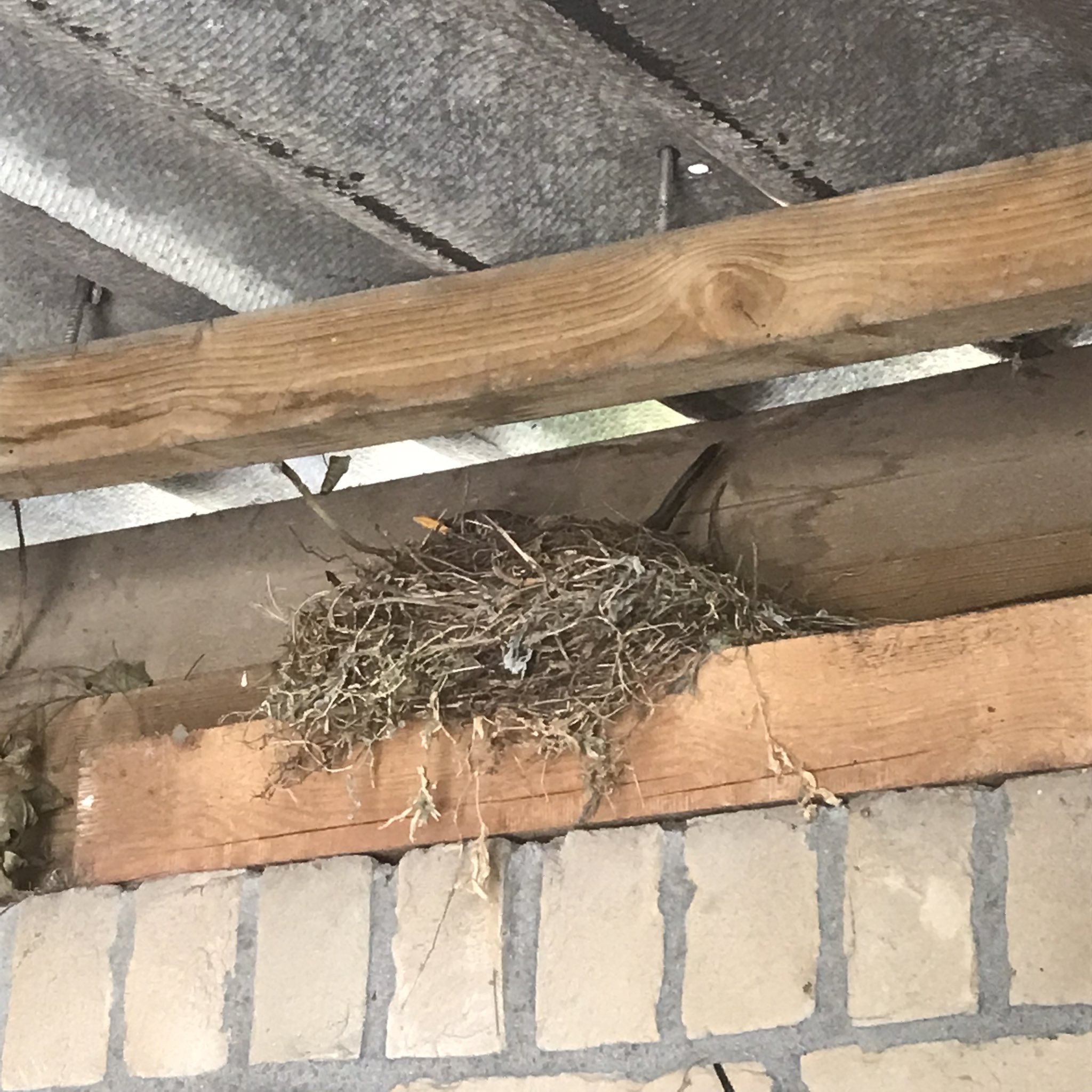 Het begon natuurlijk met het bouwen van het nest, begin mei. Ik had ze eerder al wel horen zingen in de buurt, maar toen ik ze af en aan zag vliegen met plukjes hooi en takjes bleek dat ze in ons schuurtje een nest aan het bouwen waren. Leuk om te zien, en ze hebben een mooie plek uitgekozen. Lekker hoog, buiten het bereik van een eventuele verdwaalde kat, en totaal niet in de weg voor ons.