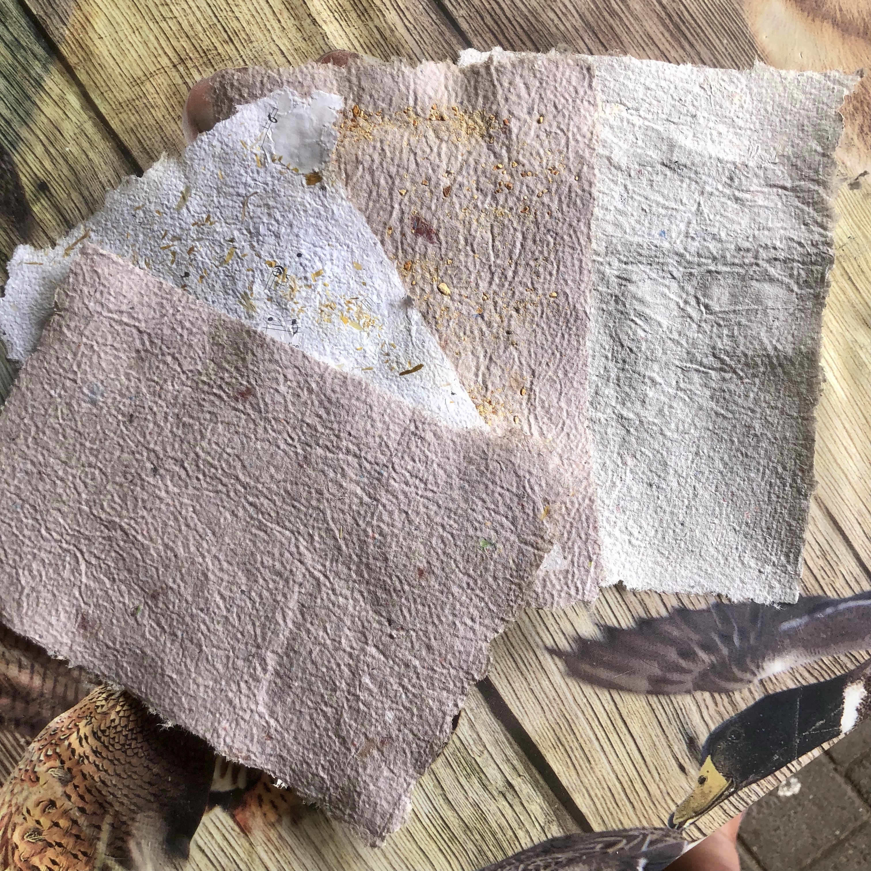 De eerste is gemaakt van hergebruikt knutselpapier, daar komt de rozige kleur vandaan. De tweede was ooit bladmuziek, als je goed kijkt zie je nog wat muzieknootjes terug. De gekleurde spikkels zijn stukjes gedroogde tulp. De derde is weer knutselpapier, deze keer met stukjes gedroogde mandarijnenschil, en de laatste is gemaakt van oude tijdschriften zoals de Margriet en de Libelle.