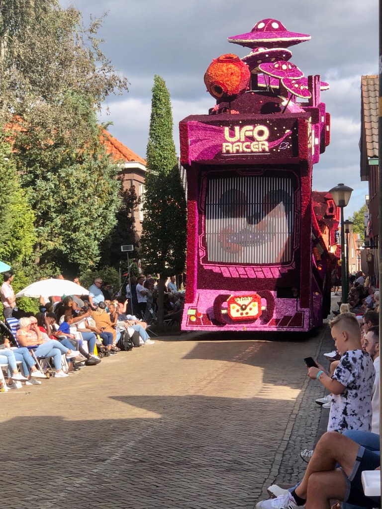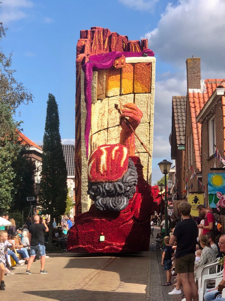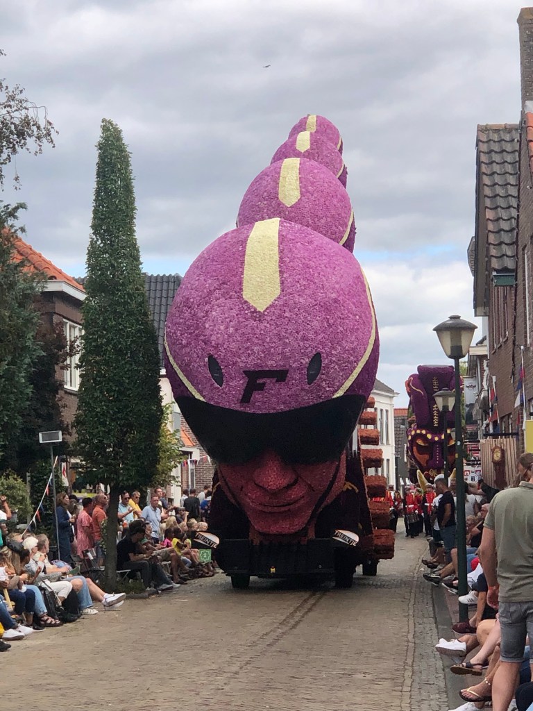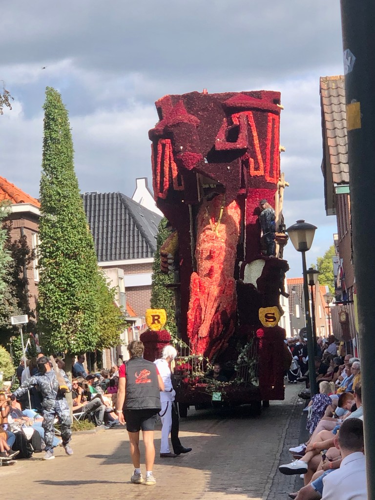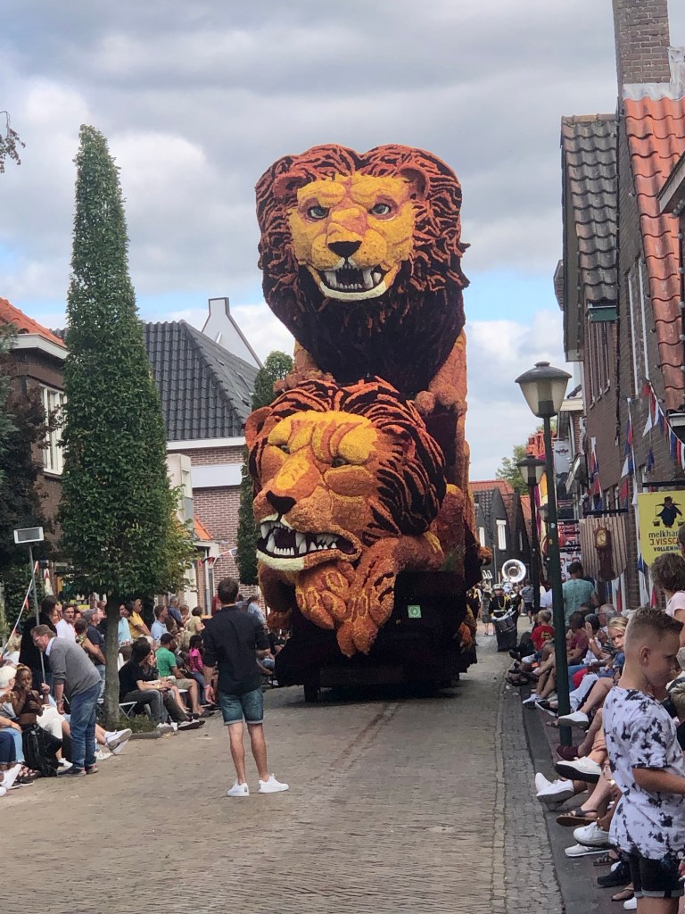Elf huizenhoge, prachtige bloemenwagens, bekleed met voornamelijk dahlia’s, maar ook andere natuurlijke materialen. Afgewisseld met fanfarekorpsen trokken ze ‘s middags en ‘s avonds twee ronden bij ons langs. Ik maakte een klein fotoverslag.