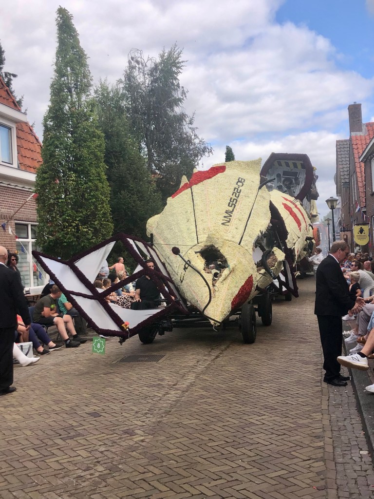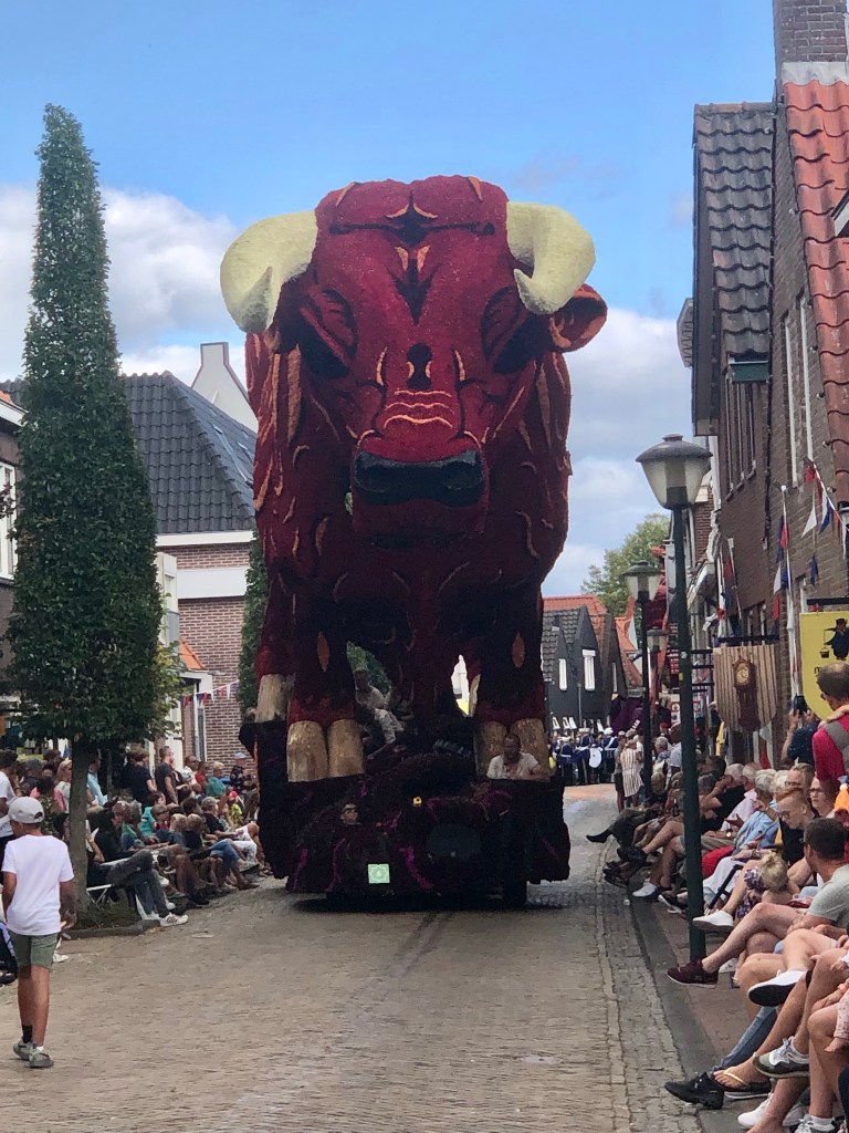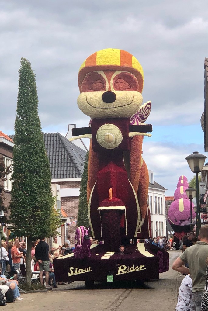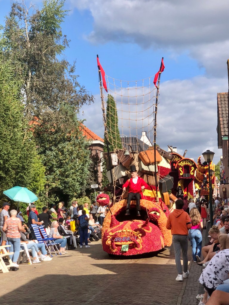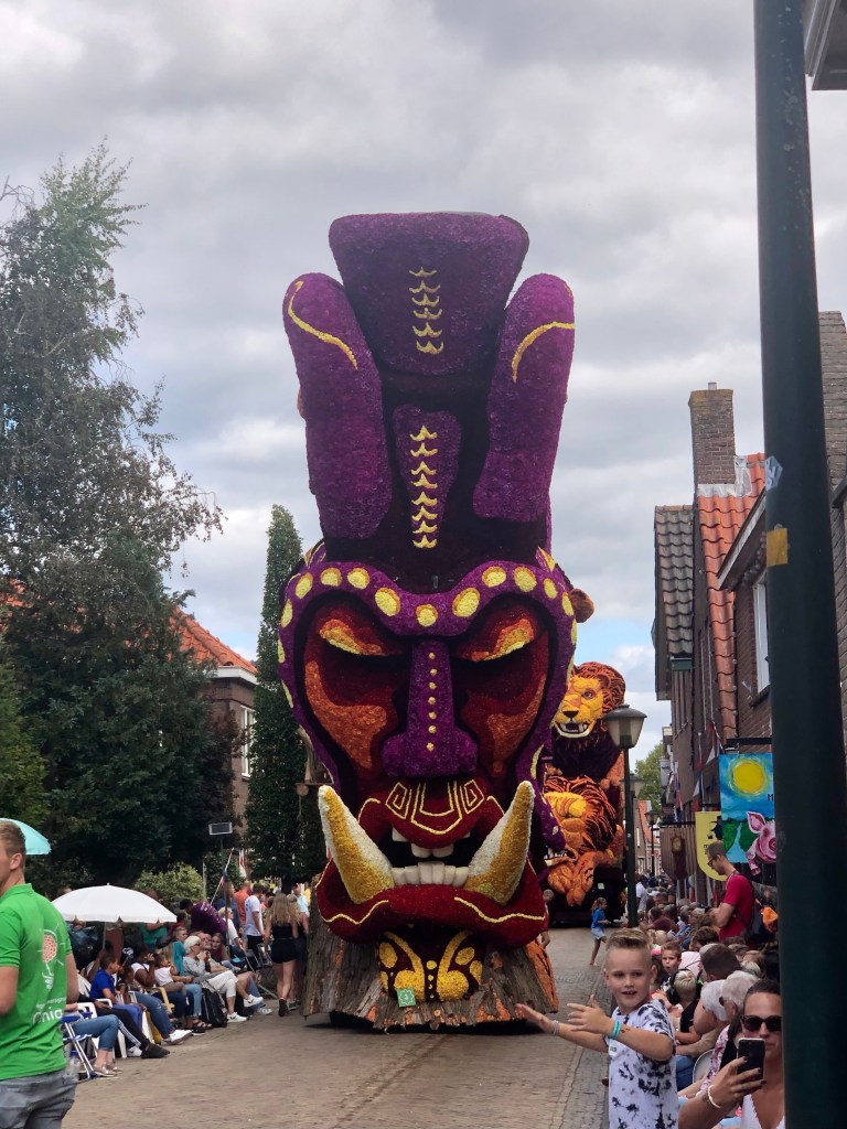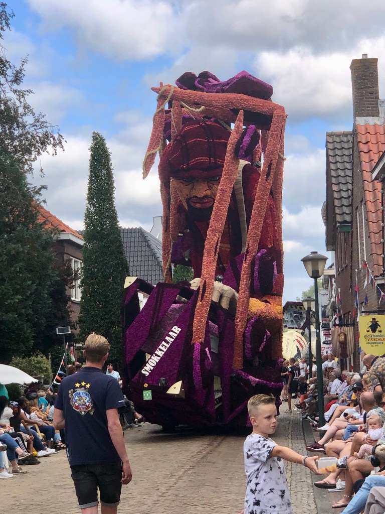 Elf huizenhoge, prachtige bloemenwagens, bekleed met voornamelijk dahlia’s, maar ook andere natuurlijke materialen. Afgewisseld met fanfarekorpsen trokken ze ‘s middags en ‘s avonds twee ronden bij ons langs. Ik maakte een klein fotoverslag.