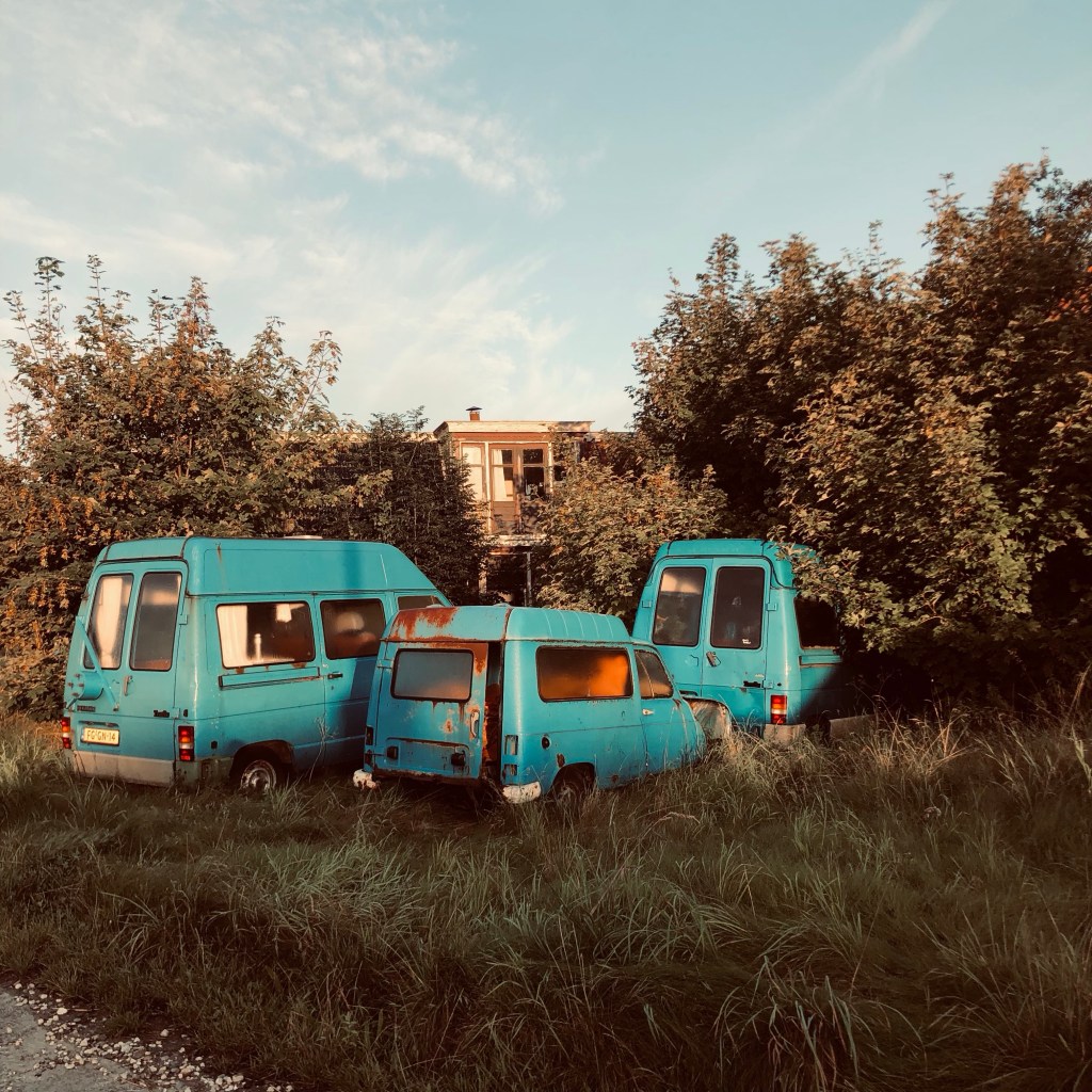 Er stonden er vier, roestig, oud, en bij ééntje stond de achterdeur een beetje open. Verscholen in de struiken stond ook nog een oude caravan.