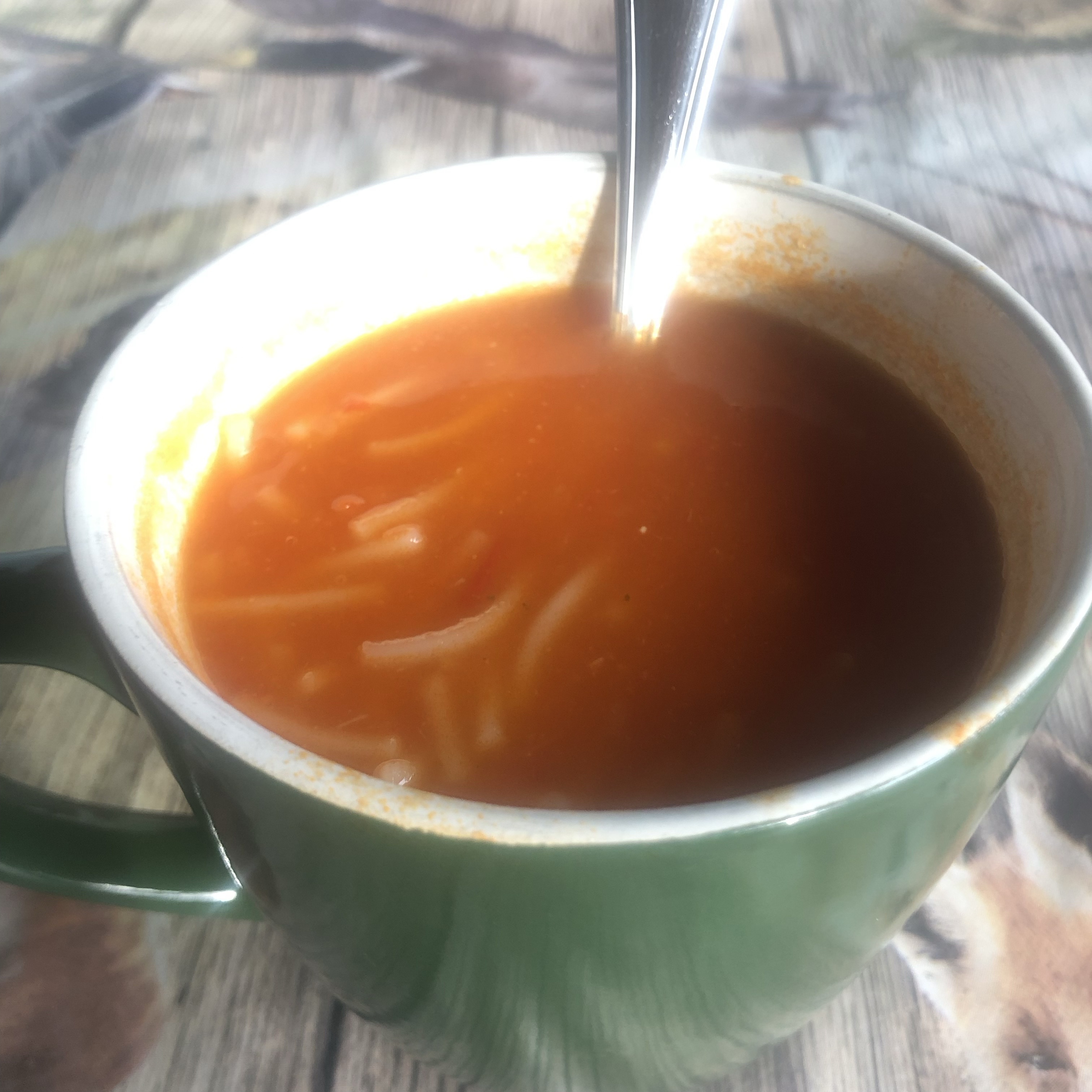 Snipper de ui en snijd de knoflook in stukjes. Bak deze kort aan. Snijd de paprika en de tomaten in grove stukken en bak ze even mee. Voeg vervolgens de bouillon toe, breng het geheel aan de kook en laat het een minuut of tien doorpruttelen. Pureer het geheel met een staafmixer of in een blender, voeg de vermicelli toe en laat het nog even doorkoken.