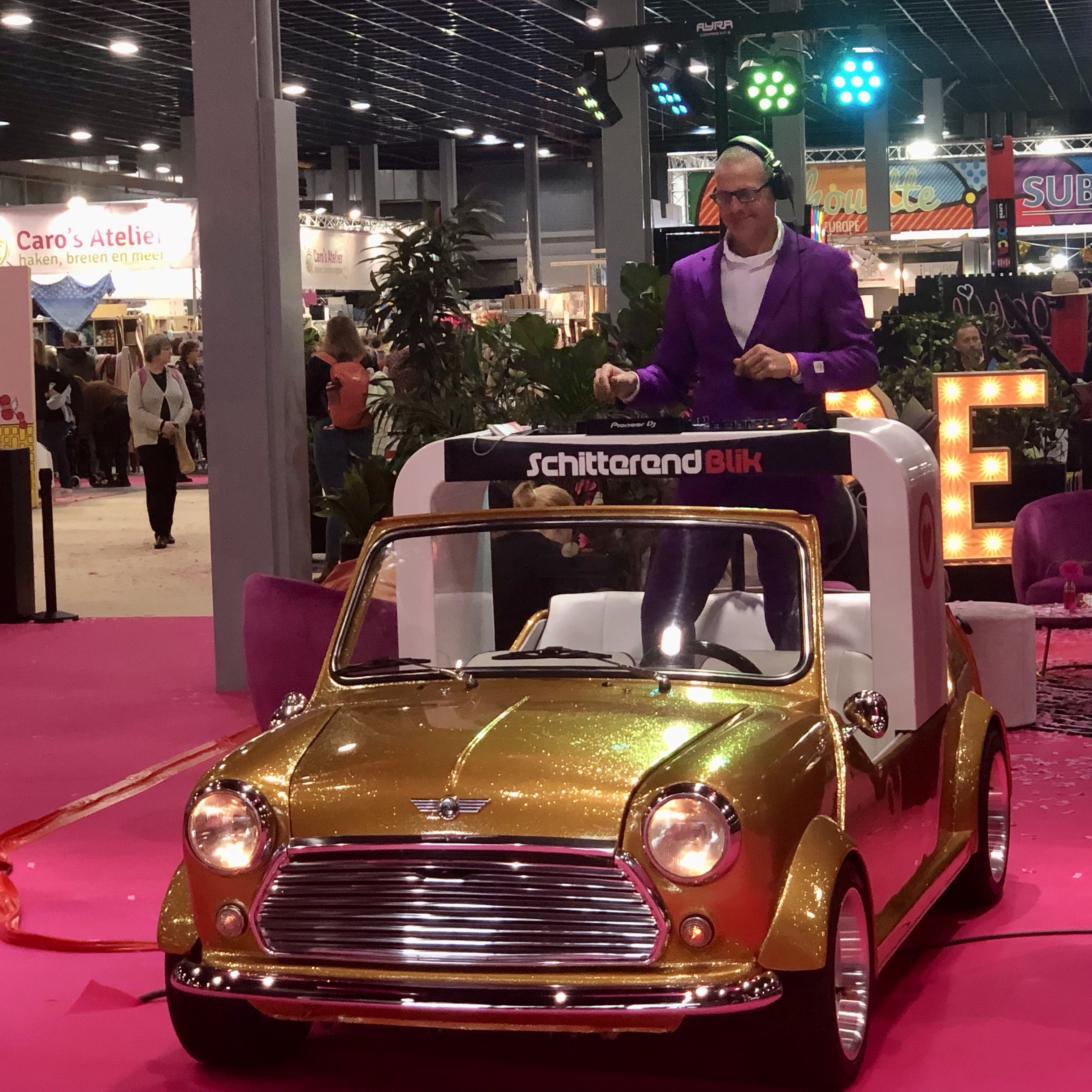 Bij de ingang werden we weer begroet door deze vrolijke dansende man met zijn gouden glittermini. Ik heb hem wel vaker gezien op KreaDoe, en volgens mij ook wel eens op een andere beurs. Altijd leuk, en als hij die auto ooit zat is neem ik hem graag over, haha.