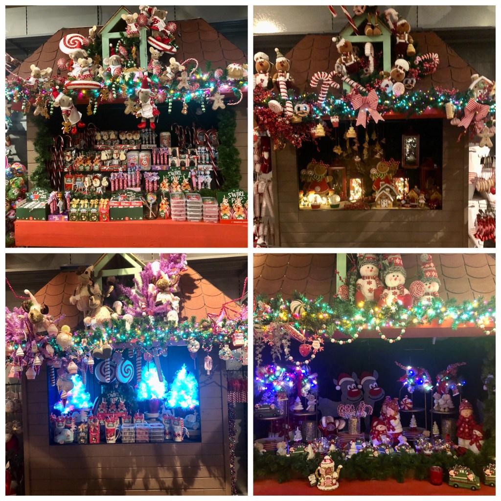 Naast de kleuren rood, goud en zachtroze die je op veel plekken ziet terugkomen zijn ook de koekjes en de snoepjes een terugkerend thema, die heb ik bij meerdere kerstshows gezien. Hier gezellig opgesteld als van die huisjes die je wel eens op kerstmarkten ziet.