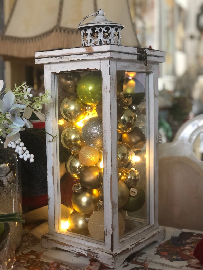 Op vakantie kochten we een mooie lantaarn met het idee om daar een leuk tafereeltje in te maken. Iets met poedersneeuw, poppetjes, hertjes en boompjes. Nu zitten er kerstballen en lampjes in. Ook heel leuk, maar niet helemaal wat de bedoeling was.