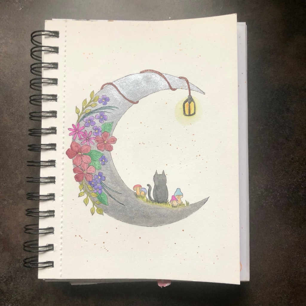 Als eerste maakte ik een fantasietafereeltje met fineliner en waterverf. De maan is gemaakt met metallic waterverf van de action die ik terugvond tijdens een opruimende. Ik had hem nog niet eerder gebruikt, maar ik was positief verrast. Metallic is lastig om op een foto te vangen helaas, maar hij is echt mooi.