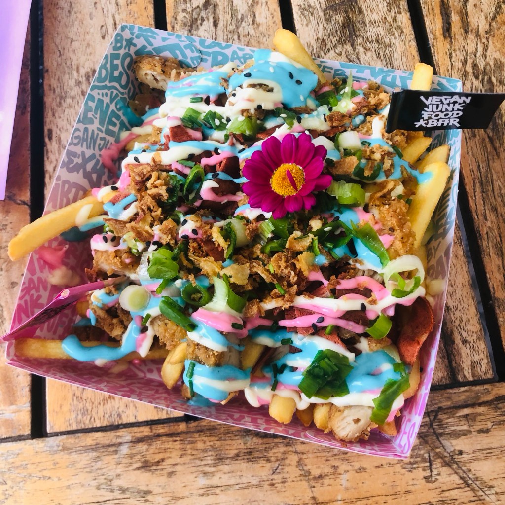 Ik ben gek op loaded fries, dus de keus was snel gemaakt. Ik bestelde de ‘Iconic Rainbow’, met Franse frietjes, Crispy Fly Wingz strips (vegan kip), ba(c)on bits en regenboogsaus, gegarneerd met lente-ui en gebakken uitjes.