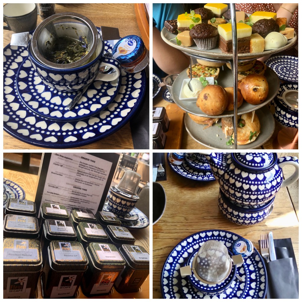 We kregen twaalf verschillende soorten losse thee, en een etagère vol heerlijke zoete en hartige hapjes. Sommige hartige hapjes zijn standaard wel met vlees, maar als je aangeeft dat je vegetarisch eet dan maken ze die apart voor je, zonder vlees.
