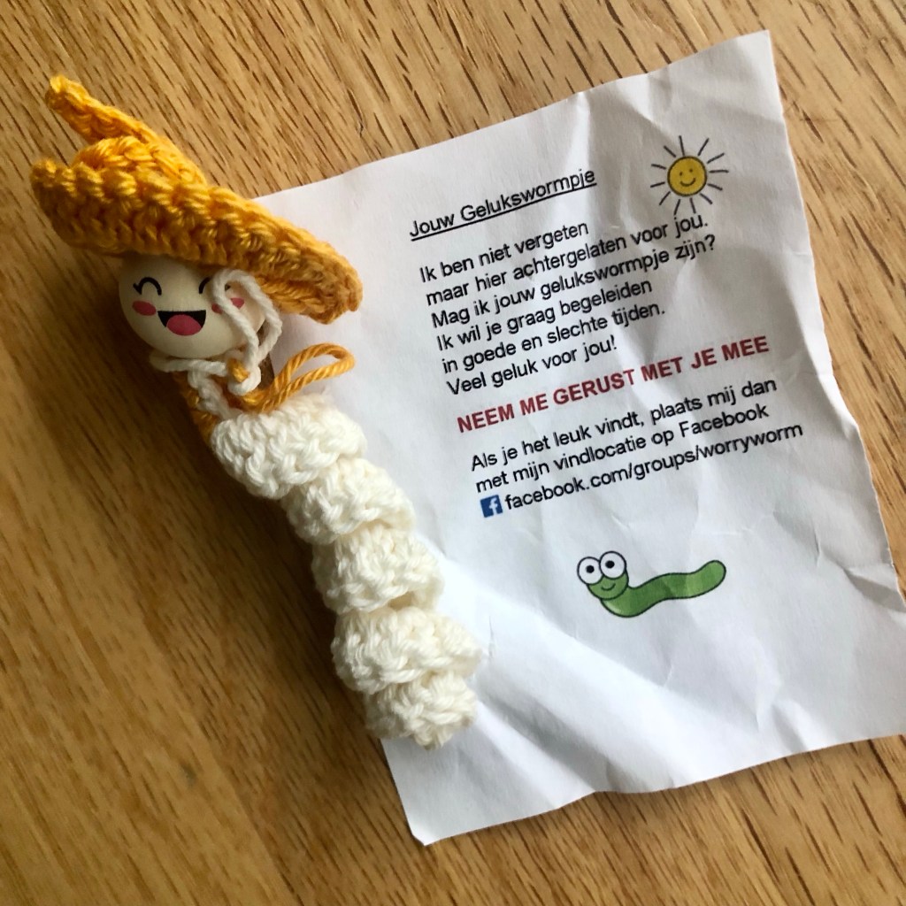 Het briefje verwees naar een Facebookgroep, waar je als je wil kunt laten weten dat je hem gevonden hebt en waar. Het bleek een groep met duizenden leden, zowel makers als vinders. De WorryWorm is bedacht in de UK en het is een ‘random act of kindness’, bedoeld om de vinder een glimlach te bezorgen. Nou, dat is gelukt, dit is toch leuk? Ze worden anoniem verspreid door het hele land, en wie er één vindt mag hem houden.