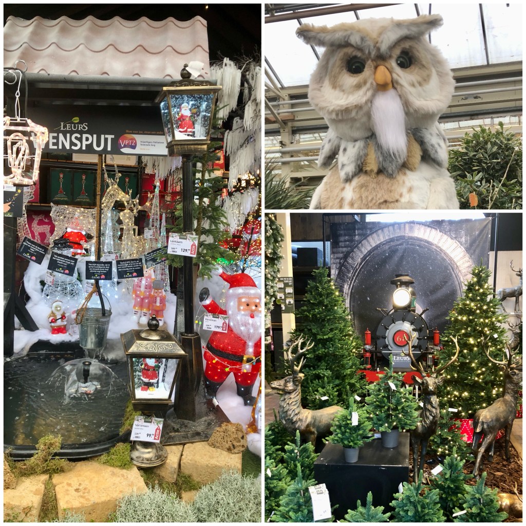 Al vrij snel na binnenkomst werden we begroet door een zingende uil. Je moet wel even op de knop drukken om hem aan te zetten. Natuurlijk zijn er kunstkerstbomen, die vond ik wel origineel opgezet zo met die trein en de rendieren. Rondom de wensput kon je verschillende buitenverlichting bewonderen. Het geld wat je in de wensput gooit gaat naar een goed doel.