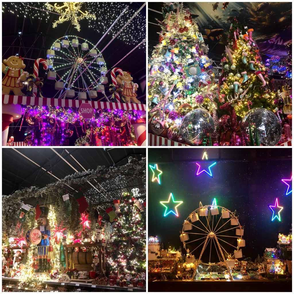 Het kermis- en discothema komt volop terug hier. Een bonte verzameling van felle kleuren, glitters en natuurlijk lichtjes. En natuurlijk heel veel mooi opgezette kerstbomen.