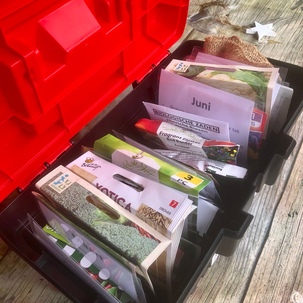 Vroeger, toen ik net begon met de moestuin bij huis, had ik een laatje in de schuur waar ik alles bewaarde. Helaas zaten daar ook muizen, en dat was dan weer niet zo handig bij de zaadjes. Tijd voor iets anders dus.