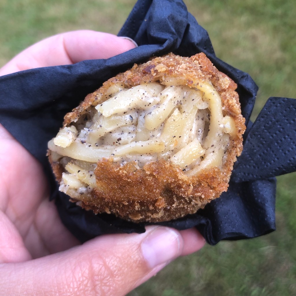 Heel stom eigenlijk, maar ik weet de naam van deze stand niet meer. Het was ook (nog) niet echt een truck, ze waren net begonnen, maar je kon er spaghettiballen eten. Wat?? Nou, een beetje zoals wij de bamibal kennen, maar dan met spaghetti. Bolognese, Cacio e pepe, Aglio e olio, je kon kiezen uit zes varianten, en die werden dan gefrituurd in een paneerlaagje. Heel bijzonder, superlekker en ze waren ook supersnel uitverkocht. Zeker een aanrader wat mij betreft.