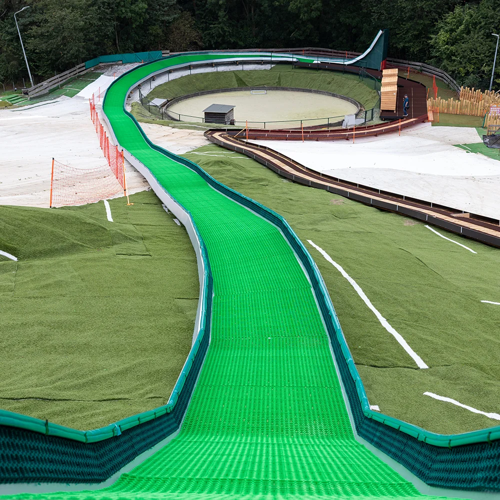 Dan de glijbaan, bovenaan staat iemand om je naar beneden te duwen. Je hoeft het dus niet zelf te doen. Het grootste deel van de baan is niet stijl, maar het eerste stukje wel. “Je moet je voeten omhoog doen, anders stoten ze tegen de rand”, zei de medewerker voordat we een duw kregen. Wacht, wat? Ik moet er zelf voor zorgen dat ik mijn enkels niet breek? Wat kan er allemaal nog meer mis gaan? Niet zoveel hoor, en toen ik eenmaal goed zat viel ook dat benen omhoog houden wel mee.