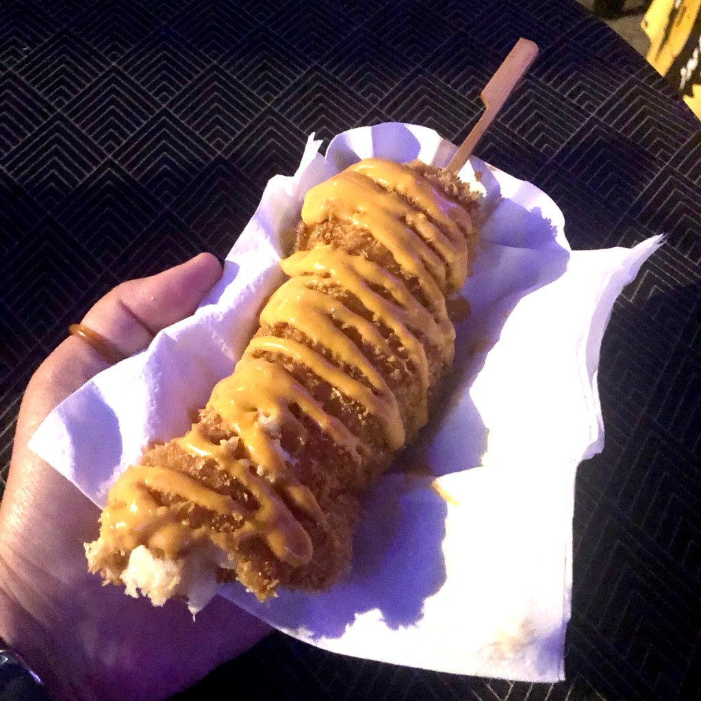 Corndogs! Die had ik nog nooit gegeten, want meestal is dat met een worstje erin, maar hier kun je ze ook krijgen met kaas in plaats van worst. Of met kaas en worst als je wil, en voor de worst kun je ook nog kiezen tussen kip of varken. Hartstikke lekker.