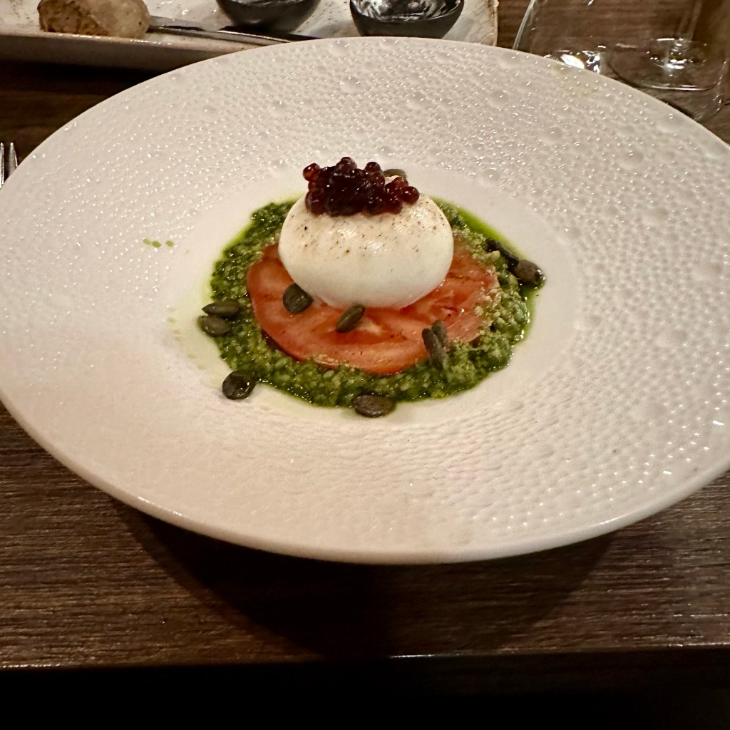 Als voorgerecht twijfelde ik tussen de burrata en de gyoza, en het werd de burrata. Deze werd geserveerd op een flinke plak tomaat, met pesto en basalmicoparels. Een erg lekkere combinatie.