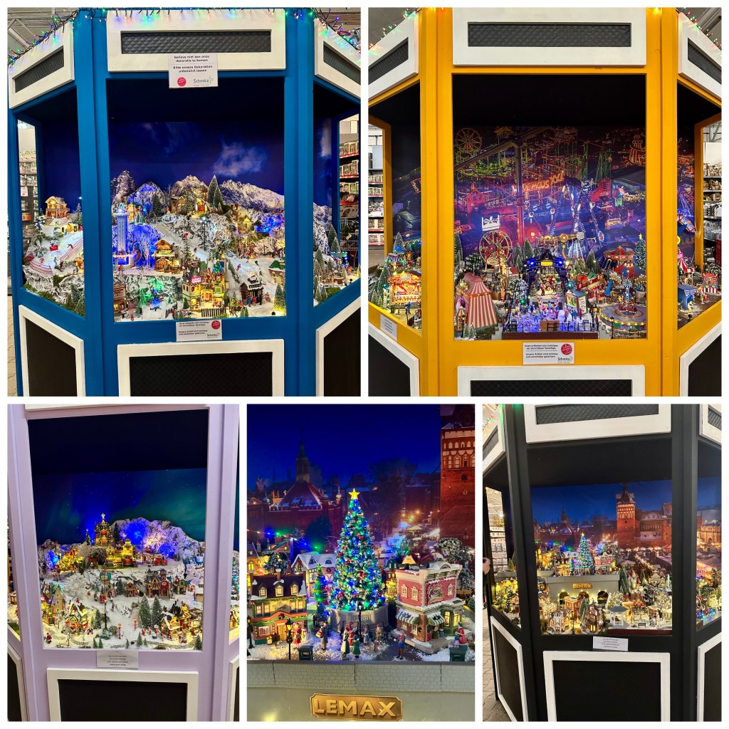 Kennelijk schermen steeds meer tuincentra hun kerstdorp op de één of andere manier een beetje af, kunnen mensen echt niet gewoon overal vanaf blijven? Hoewel ik het jammer vind dat het nodig is vind ik dit wel een originele manier om de huisjes te laten zien, verschillende thema’s in verschillende ‘kasten’.