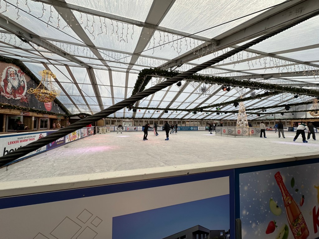 Je vindt er ook een grote ijsbaan, waar je ook schaatsen kunt huren. Voor mij niet verstandig, maar het kriebelde wel even. Gelukkig was het naast de ijsbaan ook gewoon gezellig, en kon je er volop warme drankjes drinken.