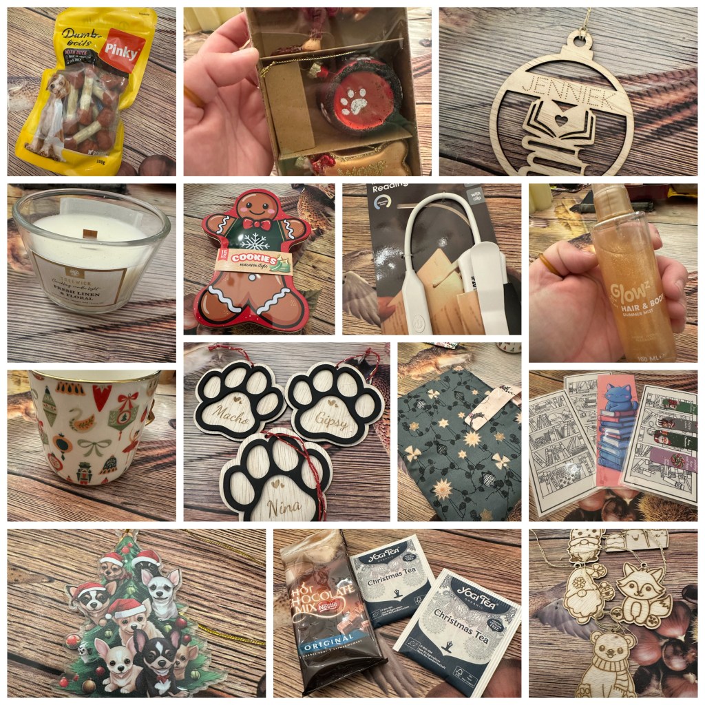 Snoepjes voor de hondjes | kerstballen met hondenthema. Het hondje had helaas een gebroken pootje, maar dat was te lijmen. | een houten kerstbal | een geurkaars | een blik met koekjes | een leeslampje | glitter body- en haarspray | een kerstmok | pootjes met de namen van de hondjes | een boekensleeve | boekenleggers | een chihuahuakerstboom | thee en chocolademelk | met de houten hangers waren de pakjes versierd.
