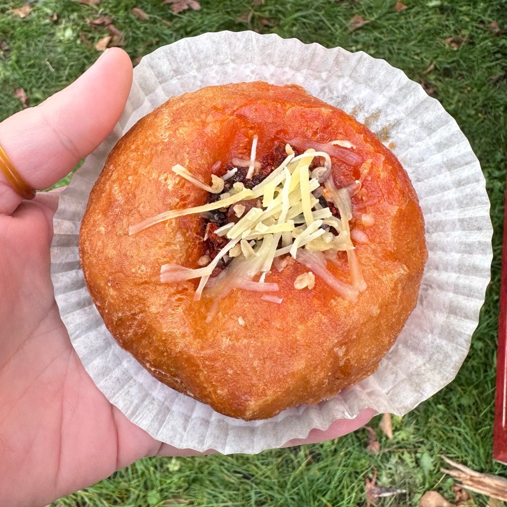 Maak het oliebollendeeg zoals je gewend bent / volgens aanwijzingen op de verpakking. Verwarm een frituurpan of een diepe pan met zonnebloemolie op 180 graden. Vorm een oliebol met een ijslepel of twee eetlepels, en doe een blokje kaas in het midden. Zorg ervoor dat de kaas helemaal bedekt is met beslag, je wil niet dat de kaas gaat lekken. Bak drie tot vier minuten goudbruin. Haal met een schuimspaan uit de pan, en top de hete oliebol af met de crispy chili oil en geraspte kaas.