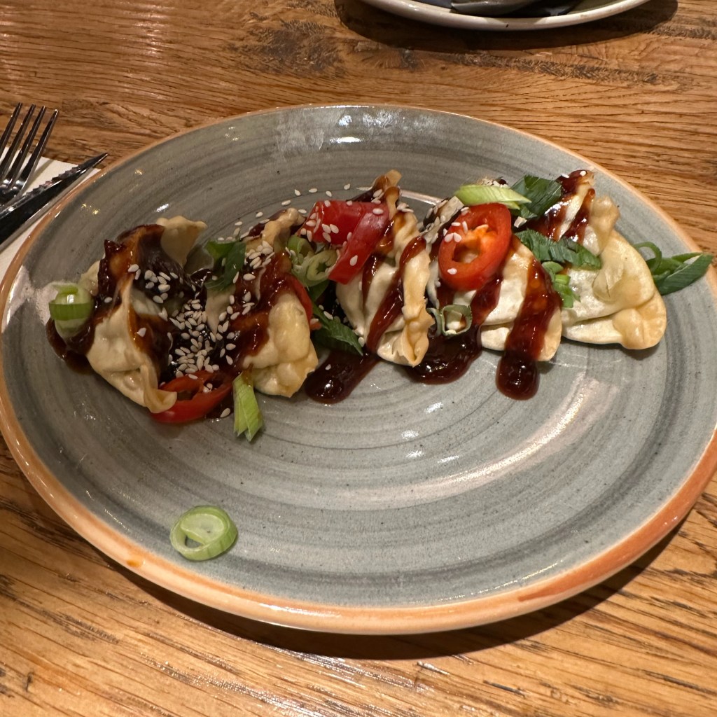 Als voorgerecht ging ik voor de vegetarische gyoza’s. Die waren gevuld met groente, en afgetopt met Spaanse peper, bosui en sesamzaadjes. Erbij zat een volgens de kaart lichtpittige saus, maar het geheel was best pittig. Ik vond ze heerlijk.